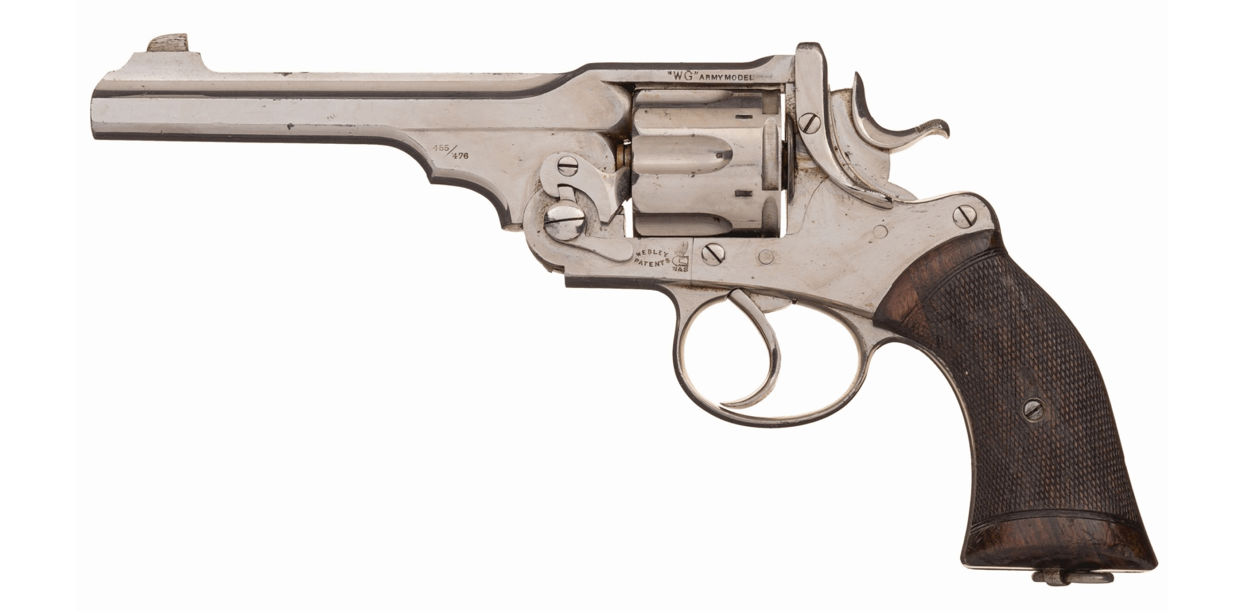 Army & Navy C.S.L. retailer-marked Webley & Scott “WG” Army Model double action .455 Eley Revolver with 6ӊsolid rib barrel. The “WG” Army Model was widely purchased from Army & Navy Cooperative Society, Ltd. (C.S.L.) stores and other retailers by British officers in the late 19th century. This one has the Army & Navy C.S.L. marking on the top of the barrel. Standard blade and notch service sights, “‘WG’ ARMY MODEL” on the left side of the top strap, “455/476” on the left side of the barrel lug, the Webley patent and bullet trademark on the left side of the frame, “9875” on the right side of the frame and left side of the heel, “8846” also on the left side of the grip frame, matching “875” on the back of the cylinder, mis-matched “9253” on the inside of the grips. Has a correct a lanyard ring on the butt. Very fine condition with 95% plus original nickel plating, minor flaking, and light scratches and marks. The grips are very good and have some small chips and bruises, a splice on the front left panel, and mild handling wear. Mechanically fine condition.  Bore has Excellent rifling, with no pitting. I’d rate the bore at 10/10. (EEEY-509) Firm Price: $1,795