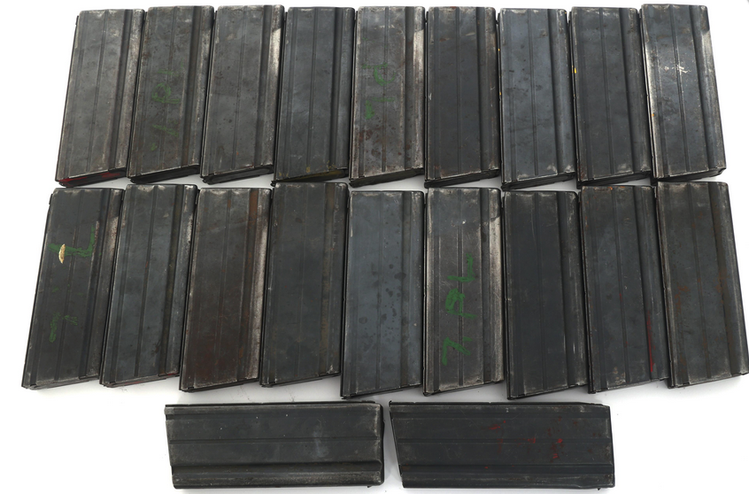 A small batch of rare 1960s-vintage Belgian metric FN/FAL 30-round steel magazines. Made by FN, Herstal, Belgium for South Africa under a pre-UN arms embargo contract. Blackish-blued, with distinctive blued Belgian followers. Many of these magazines were used in the Rhodesian Bush War. These are in well-used condition, with most showing plenty of wear and scattered corrosion. (See photo.) A few of them have very minor dents that do not impede follower travel. A few of them have small residual tracess of Rhodesian camouflaging “baby poop ” paint or Zimbabwean brown paint on one side or in the grasping grooves You will be getting “luck of the draw” from the batch that is shown in the photo. At last count, I had 19 left. These are priced at $175 each, with a flat rate shipping of $15. (You pay the same $15 shipping whether you buy just one magazine, or all 19 of them.) These have been very scarce in recent years. They often sell at auctions for $200+ apiece.