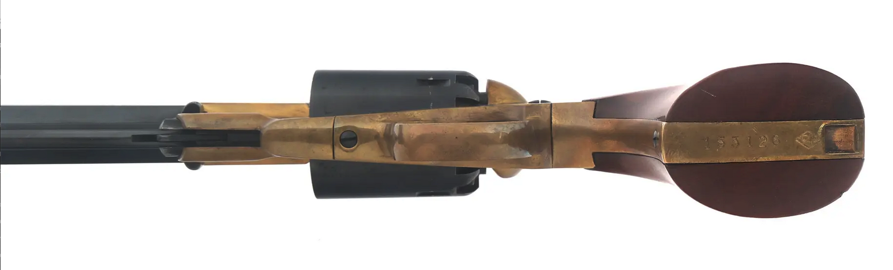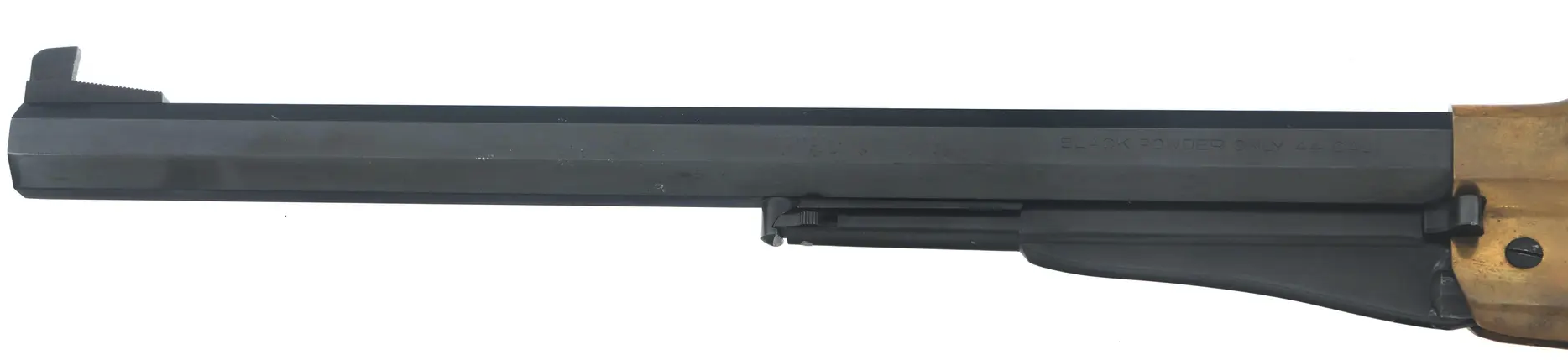 A scarce brass frame Pietta M1858 Remington replica .44 blackpowder revolver with 12.1″ octagonal barrel and squared-off target sights. The frame is notched to accept detachable buttstock. (Those are widely available.) This variant with the long barrel has not been produced or imported for many years, and they are much sought-after. This revolver has just few handling marks and considerable brass toning. (See photos.) Otherwise, it is in excellent condition. This should make a great practical shooter or display piece. Pietta M1858s can be very accurate! (PKI-002)